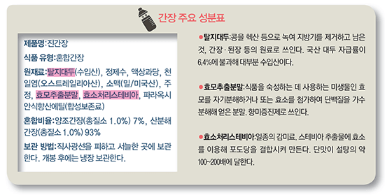하지만 매일 먹는 반찬과 음식에 들어가는 장류에서부터 각종 감미료와 조미료가 다량으로 들어가는 것을 생각해 본다면, 메주를 자연적으로 발효시키지 않고, 빨리 만들기 위해 탈지 대두에 염산 같은 강산을 부어 단백질을 분해시키고, 인공 감미료나 색소를 넣어 만드는 산분해 간장이나 혼합간장은 진짜 간장이라고 볼 수가 없습니다.