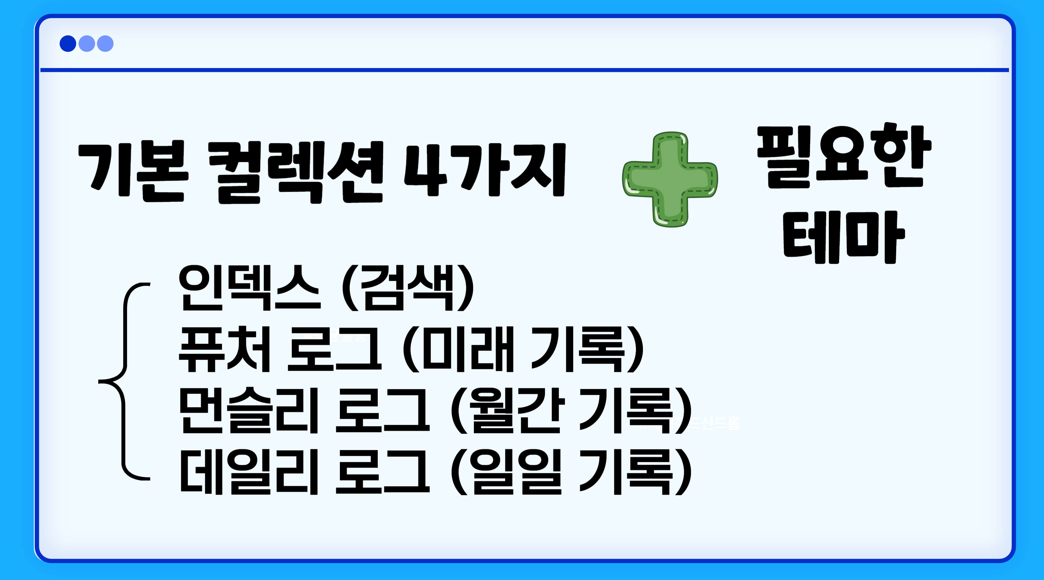 불렛저널은 기본 컬렉션 4가지에 본인의 필요에 따른 테마를 더해 만듭니다. 컬렉션이라는 것은 쉽게 말하면 주제에 따른 '양식(템플릿)' 모음입니다. 가계부 컬렉션이라면 가계부 내용을 기록하기 위한 양식(템플릿)을 의미하는 것입니다.