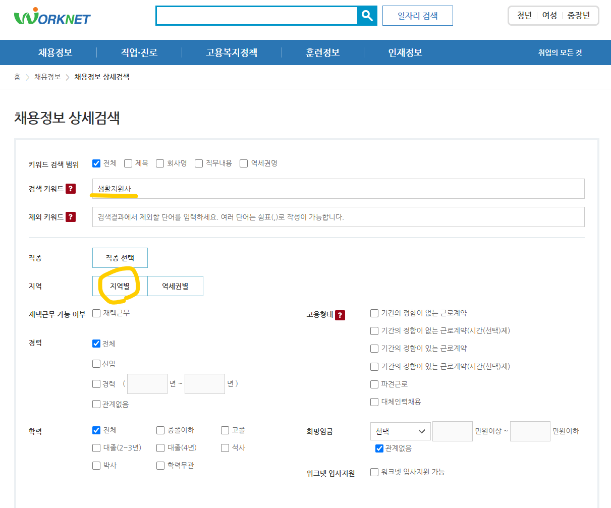위의 내용이 번거로우시다면 워크넷 사이트를 활용하는 방법도 있습니다. 채용 정보 상세 검색에서 '생활지원사'로 검색하면 됩니다. 검색하실 때 해당 지역을 체크하고 하시면 됩니다.