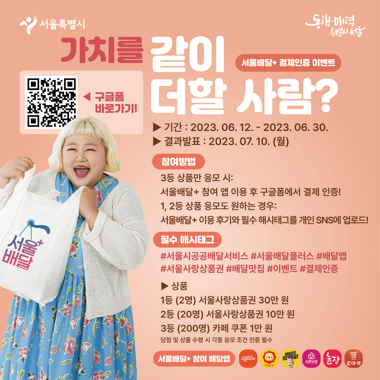 ‘가치를 같이 더할 사람’을 통해 총 222명에게 서울사랑상품권 등을 증정합니다. 이 행사는 결제 수단에 상관없이 이벤트 기간 「서울배달+」 참여 배달앱을 이용한 소비자라면 누구나 응모할 수 있습니다. 응모 방법은 아래 사진과 같습니다.