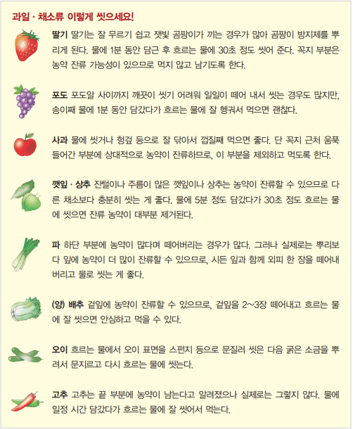 - 1% 정도의 농도로 세제를 푼 물 : 깻잎 약 90% / 상추 97% 잔류 농약 제거