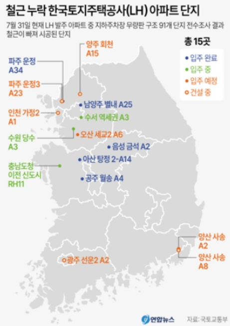국토 교통부가 무량판 구조 방식으로 지은 LH 아파트 91개 단지를 전수 조사한 결과, 15개 단지에서 철근 누락 등의 하자가 발견되었습니다. 철근 누락한 시공사 명단에 중견 건설사들이 대거 포함되어 있는 것을 보면, LH만의 문제는 아닌 것 같습니다.
