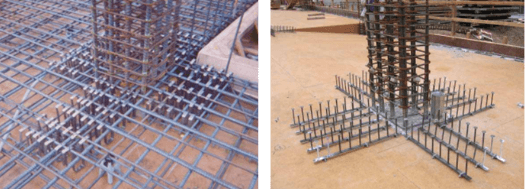 이런 경우에는 드롭패널이나 칼럼 헤드가 없이 유지하기 위해, 기둥 안의 철근과 천장에 가로로 지나가는 철근을 서로 꼬아서 묶어두고 패널 역할을 대신하도록 해야 하는 구조입니다.