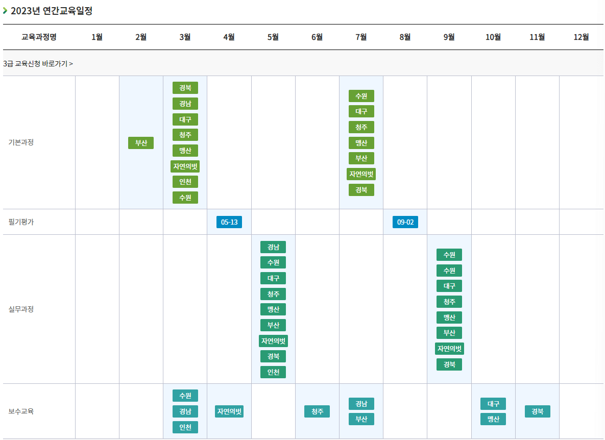 3급 교육 과정은 위의 표를 보시면 아시겠지만, 온라인 54시간과 대면 90시간으로 총 144시간이 소요됩니다. 대면의 경우, 주말에만 진행하는 경우도 있으니 참고하시기 바랍니다.