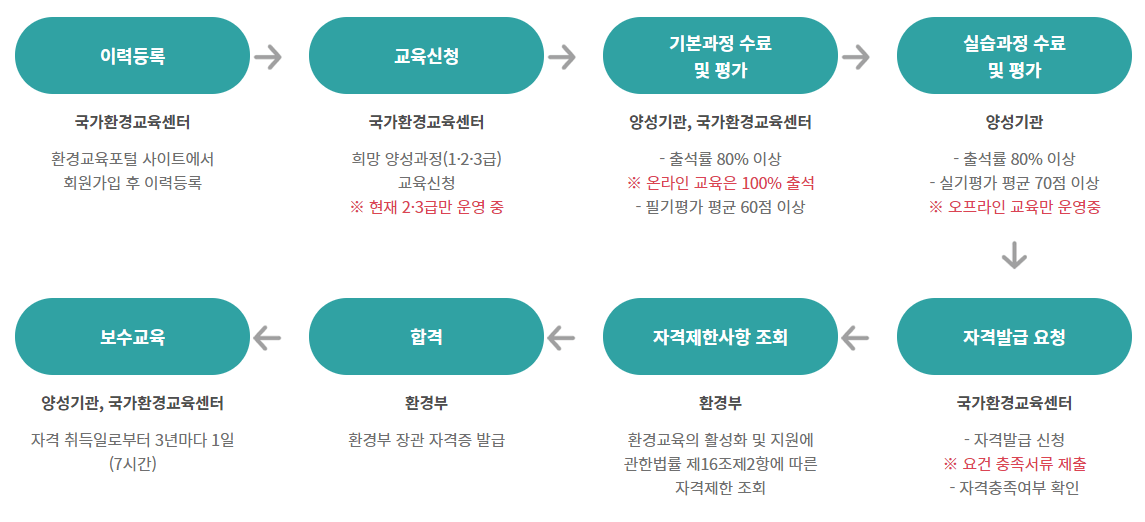 | 기간 | 접수 | 수강 및 시험 응시 | 환경 교육사 자격 취득 |